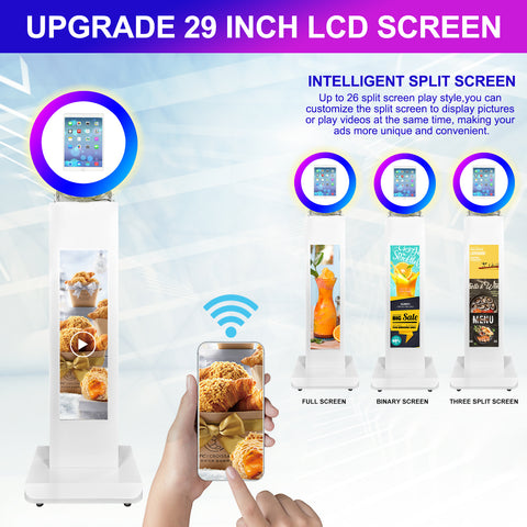 - 29 Inches LCD Screen: Upgrade iPad photo booth is designed with a 29 inch LCD large display screen. Up to 26 split-screen play styles, adware supports computer version, stand-alone version and mobile APP to control the play of ads, the pictures and videos on the mobile phone can be directly played and displayed on the screen body, advertising play more convenient and more efficient.