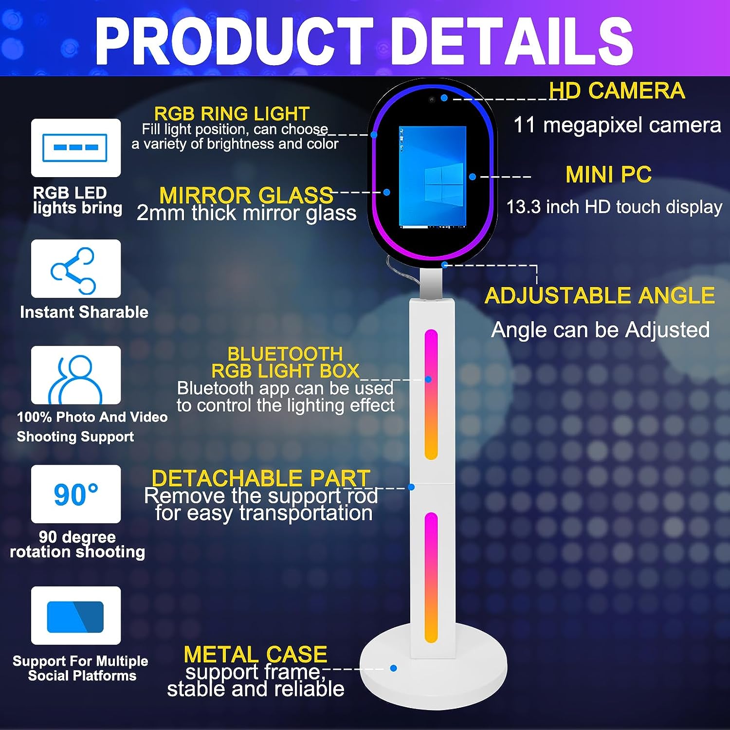 Mirror Photo Booth gallery features a 13.3" LCD screen with capacitive touch technology, PCintel i5 3 generation 8GRAM + 256GSSD and includes a HD camera.With photo software.